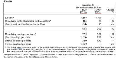 Free cash flow for the period was a net inflow of US$89 million, compared with US$61 million in the first half of 2024. As at 30 June 2025, the Group’s net cash was US$442 million, compared to US$468 million net debt at 31 December 2024.