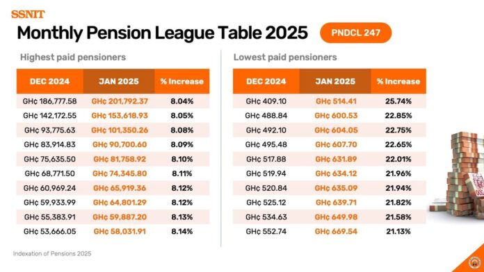 For instance, the highest pension moved from GH¢186,777.58 in December 2024 to GH¢201,792.37 in January 2025, while the lowest grew from GH¢409.10 to GH¢514.41.